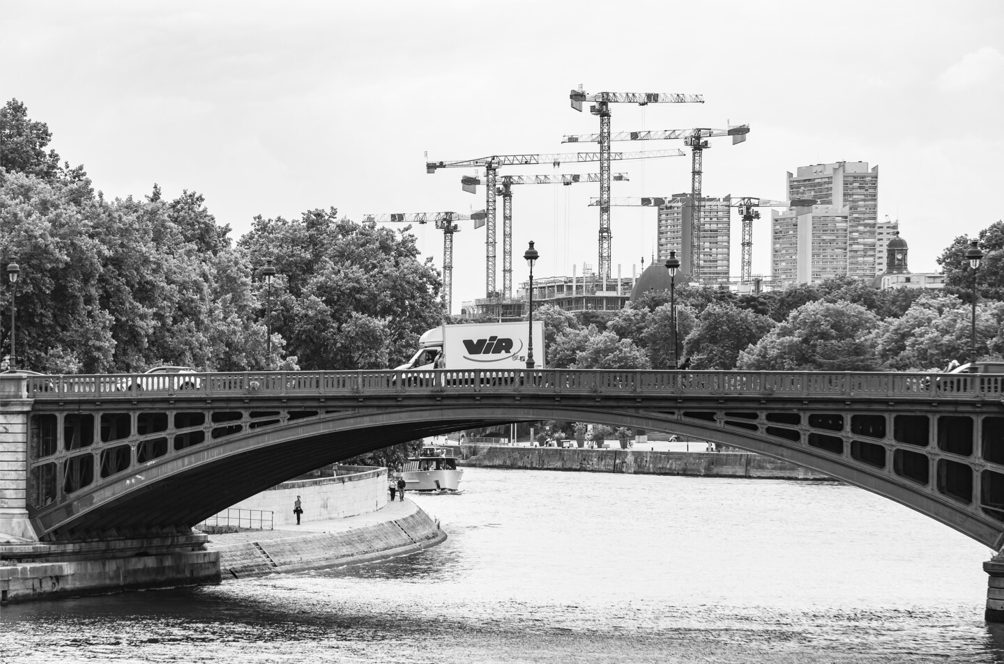 Vue sur la Seine avec le Pont de Sully. Il relie les 4e et 5e arrondissements dans l’axe du boulevard Henri IV pour arriver boulevard Saint-Germain. Il s’agit en fait de deux ponts distincts, unis par une section du boulevard Henri IV, chacun prenant appui sur l’extrémité en amont de l’île Saint-Louis. Le pont vers la rive droite débute quai Henri IV pour finir quai d’Anjou, et celui vers la rive gauche commence quai de Béthune pour déboucher sur les quais Saint-Bernard et de la Tournelle.
