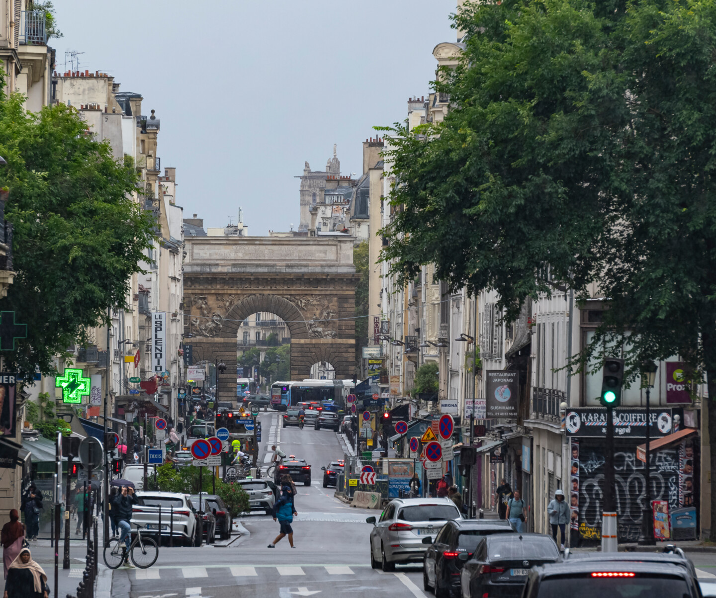 Vue sur la Porte St Martin depuis la rue du faubourg St Martin. L'édifice se trouve au croisement de l'axe Saint-Martin (rue Saint-Martin et rue du Faubourg-Saint-Martin) dans le 10e arrondissement et des Grands Boulevards (boulevard Saint-Denis et boulevard Saint-Martin).