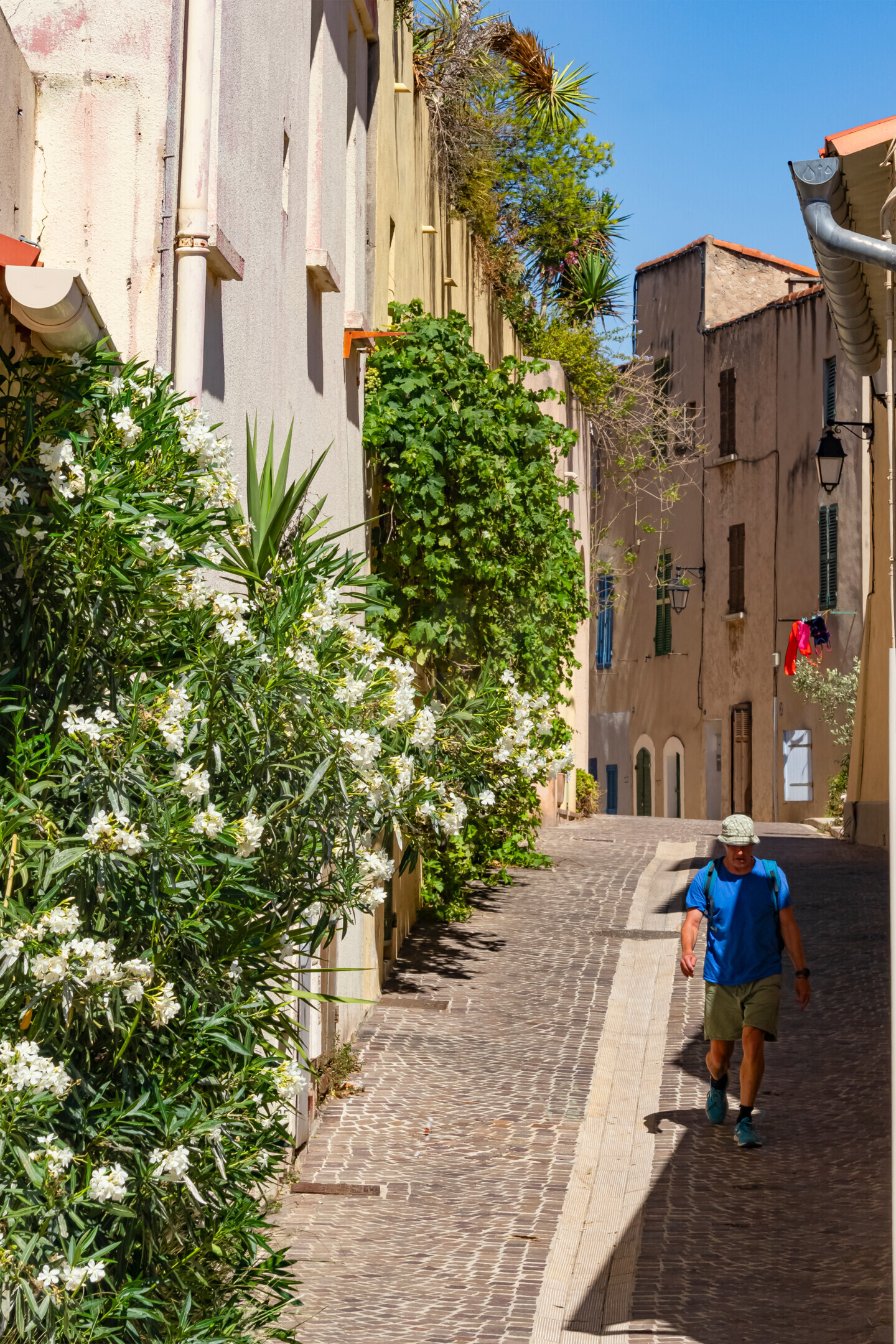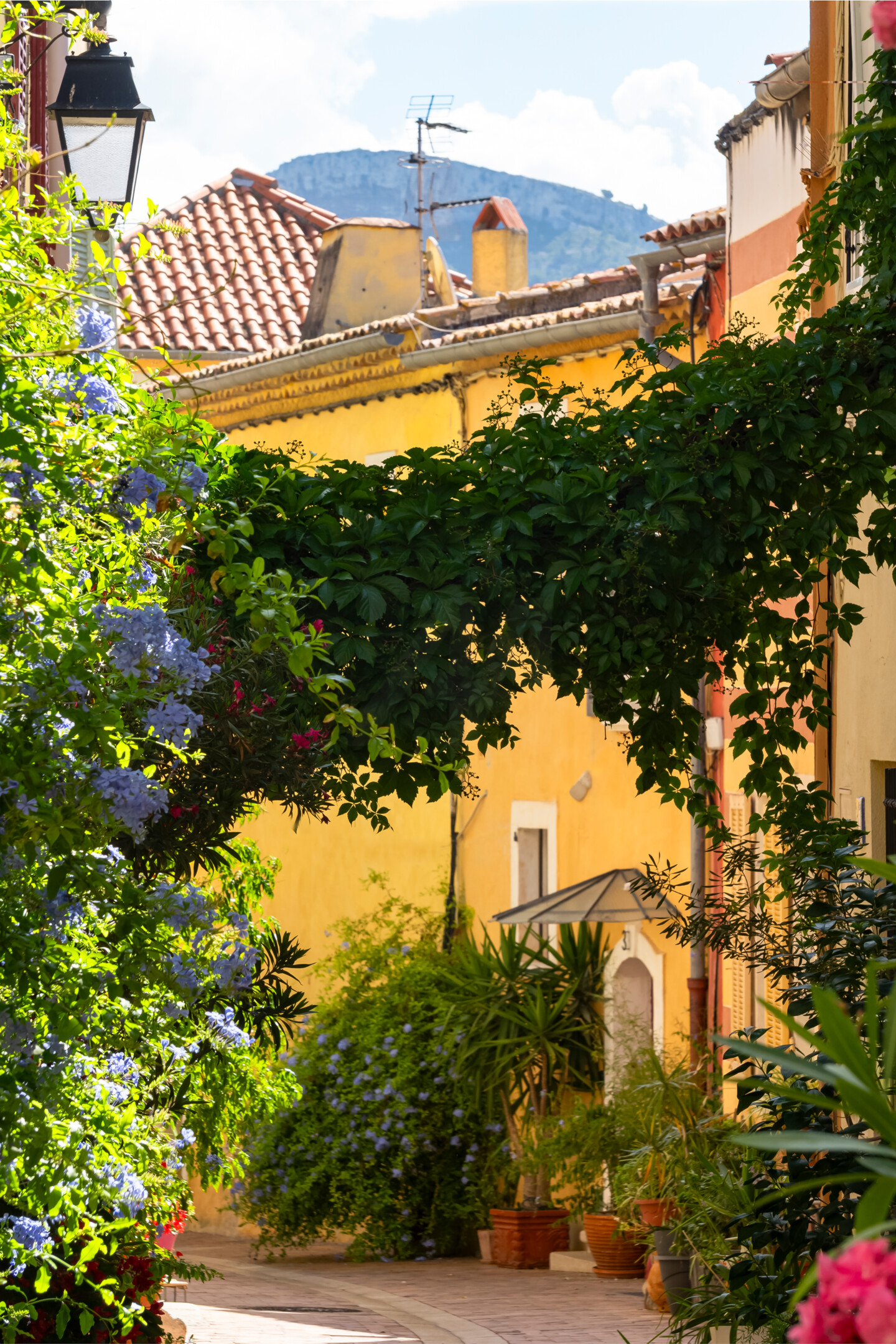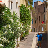 Architecture de la rue du Jeune Anarcharsis et les montagnes en arrière-plan . C'est une des rues anciennes les plus passantes de la ville l'été.
