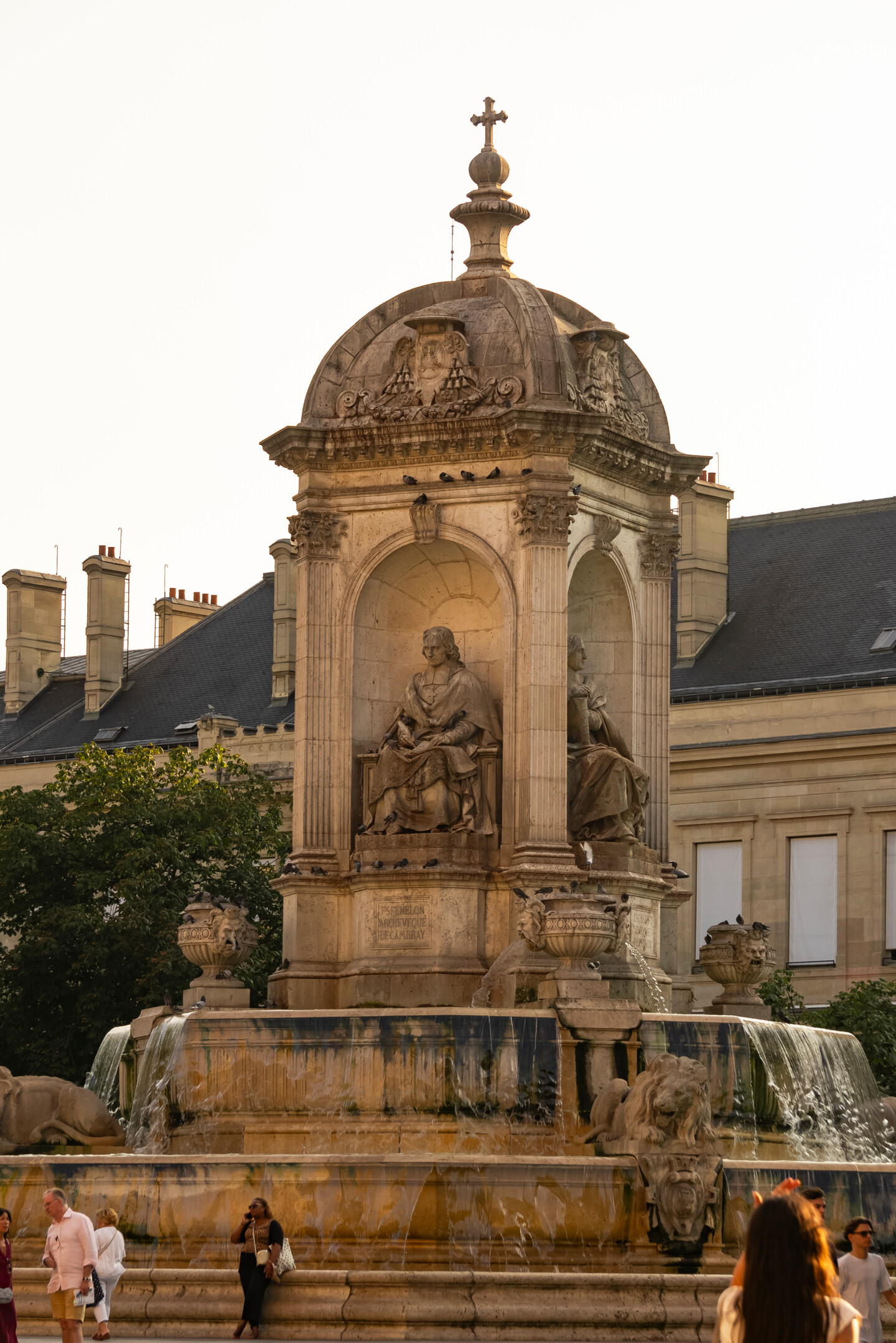 Une scène de rue devant la fontaine St Sulpice le soir.